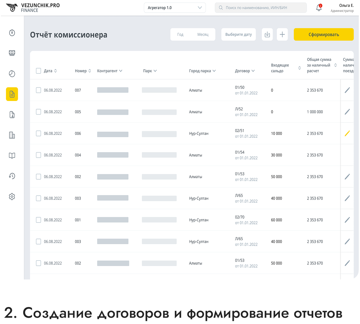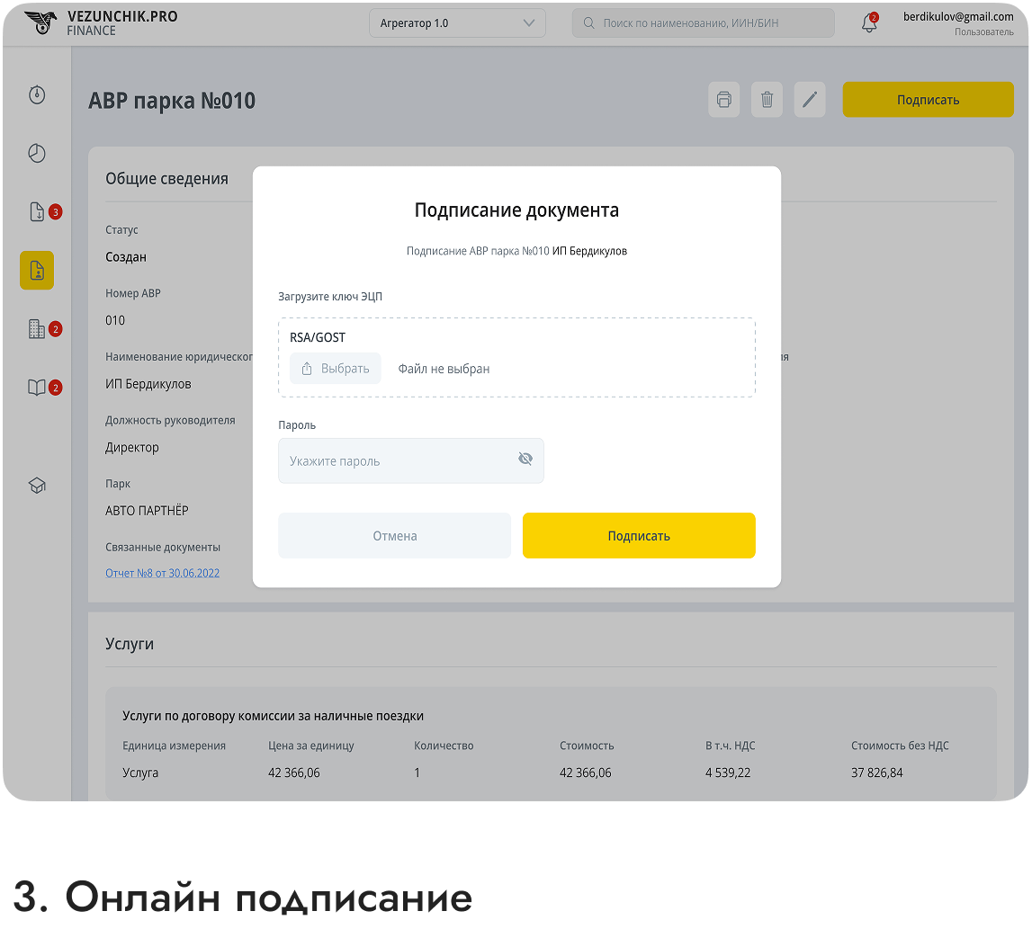 Kulenkov Group разработала специализированную систему для клиента из индустрии такси в Казахстане. Ранее менеджеры вручную собирали данные в Excel, формировали договоры и акты, рассылали их по почте и ожидали подписей. Vezunchik Pro Finance автоматизировал весь этот процесс — от сбора данных и генерации документов до онлайн-подписания с помощью ЭЦП